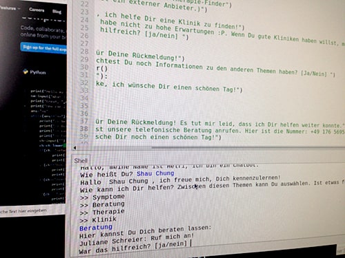 shauchungshin-ki-jumpp-chatbot 3. Mai 2021 Schreibe einen Kommentar Gerade fing ich an, auf dem Geschmack zu kommen: Meine erste programmierte Frage- und Antwortsequenz für einen Chatbot, der Menschen Orientierung bei der Suche nach passenden Angeboten im Bereich mentale Gesundheit bietet.